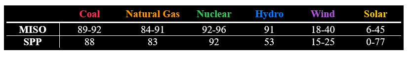 Some sources of energy are more reliable than others, and there are numerous ways to measure this: accredited capacity, unforced capacity (UCAP), or capacity value. All three measure the general reliability value to the grid. The figure below displays capacity values for the two main regional energy organizations in Missouri—Midcontinent Independent System Operator (MISO) and Southwest Power Pool (SPP):