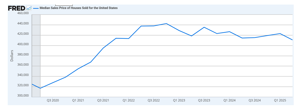 In a well-functioning market, the process should have reversed itself. The higher interest rates pushed the total price of purchasing a home back up, which surely lowered demand. At the same time, with house prices still far above the pre-pandemic level, builders should have been building like mad to bring homes to the market. These two forces should have resulted in a housing price correction. But this is not what happened. The higher interest rates have cooled demand, but prices remain high. Below is a chart I created using the Federal Reserve Economic Data (FRED) system. It shows the trend in the median U.S. home price since February 2020, just before the pandemic. The average price of a home in the United States grew by roughly $120,000, or about 38 percent, from the first quarter of 2020 to the third quarter of 2022. It has declined modestly of late, but not much.