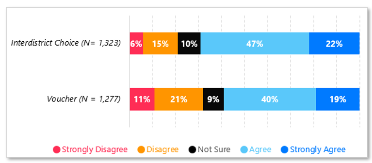 Support for both options crossed party lines. Among self-identified Republicans, 67 percent supported interdistrict choice and 57 percent supported vouchers. Among self-identified Democrats, 71 percent supported interdistrict choice and 62 percent supported vouchers.