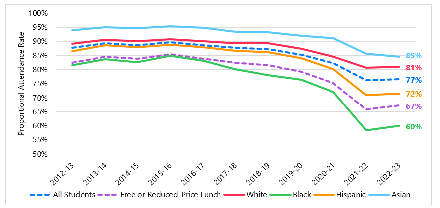Below is a graph that displays attendance trends broken down by demographics in Missouri. The graph uses proportional attendance rates. Proportional attendance rates measure the number of students who attend school 90 percent of the time or more. Let’s say a district of 10 students has a school year of 100 days. Then, let’s assume that 6 of the 10 students attend more than 90 days of school, and that the other four students attend school for 82 days. The district’s proportional attendance rate would be 60 percent.