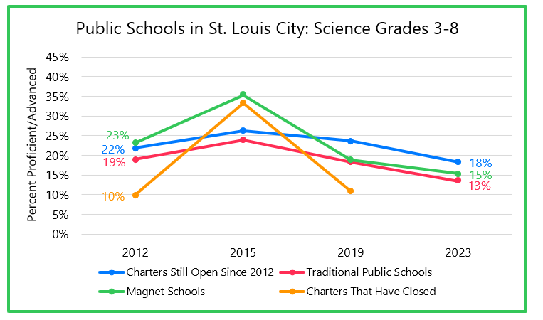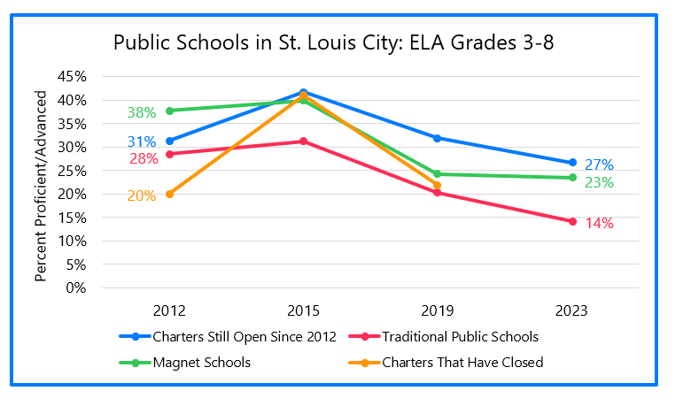 One common argument against charter schools is that some have low test scores. It’s true that some charter schools, particularly in the City of St. Louis, have rather low test scores. However, one key difference between charter schools and traditional public schools is that low-performing charters shut down. When successful charters stick around, they should provide benefits for the student population in the area. Looking at test scores in the City of St. Louis from 2012 to the present, this idea seems borne out by the data.