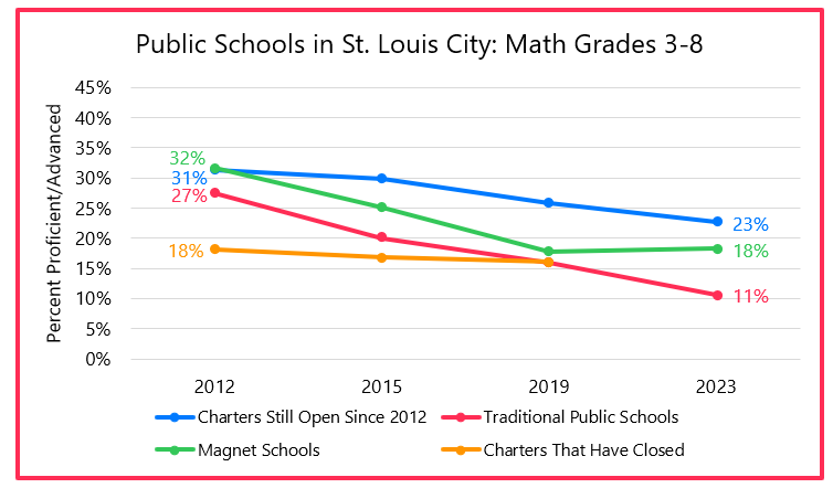 Using school-level data from the Missouri Assessment Program (MAP), we evaluated four different types of schools in the City of St. Louis: charters that were open in 2012 and are still open today, charters that have closed any time between 2012 and 2024, magnet schools (which filter enrollment), and traditional public schools. We looked at the total number of students who scored proficient or advanced in each category (charter, magnet, etc.,) and divided it by the total to calculate the percentages. In these totals, grades 3–8 are all aggregated together, and Algebra I and English II students are also included.