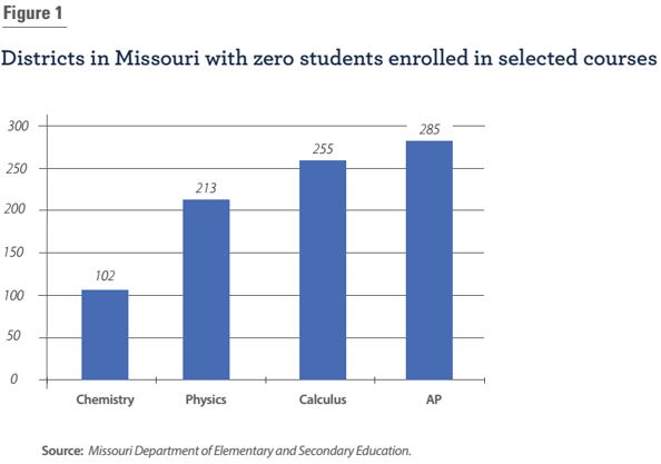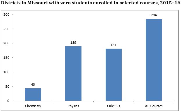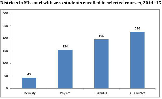 To investigate, we reached out to DESE and asked for enrollment data in Chemistry, Physics, Calculus, and AP courses from the 2014–15 school year. We counted up the number of districts that had zero students enrolled and then subtracted it from the total number of districts. Here is the figure from the report.