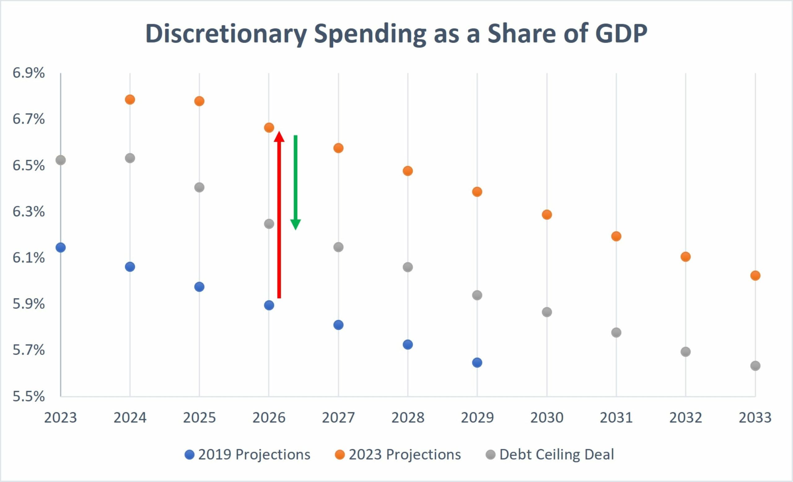 As the figure makes clear, the debt ceiling deal essentially takes discretionary spending halfway back to the path it was set to follow before COVID-19 and the change in administration.