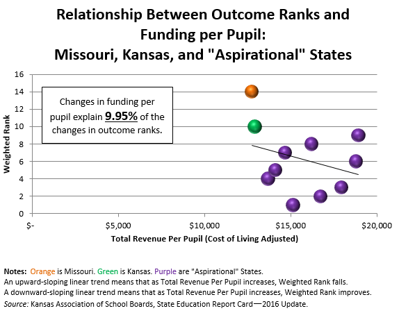 Last week, the Kansas Association of School Boards (KASB) released the State Education Report Card for 2016. In it, KASB ranks states, including Kansas and Missouri, on fifteen performance measures. It then compares that ranking to state spending per pupil. The Executive Director for KASB speaks to Kansas coming in at 29th for spending per pupil in 2014 and then elaborates,