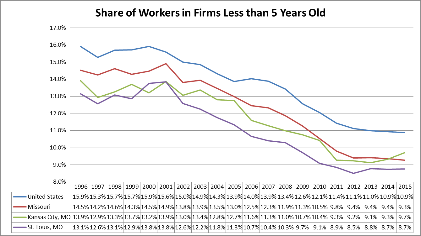 At the national level, the share of workers in firms less than 5 years old is now at 10.9%, the lowest it has been on record. The trend prevails in Missouri as well—the state now sits at 9.3%. A look at the table below shows that Missouri and its two largest population centers were growing with the U.S. average share until 2001. Since then, Missouri, has lost a larger percentage of its startup workers than the nation, and Kansas City and St. Louis have lost a larger percentage than Missouri.