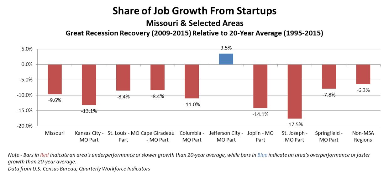 Why are there a smaller percentage of workers in startups, considering the state is at a new record high level for the number of non-farm jobs? Data suggest that Missouri startups are taking less of that job growth pie than they did before. Since 1995 to 2015, job growth from startups was near 72% of all job growth in the state of Missouri. If we look at this 20-year performance as a “normal” share of job growth from startups, then seeing a startup share at 62.5% should come as a disappointment. Of course, growing shares of workers in large, established firms can also spur growth. However, there are specific advantages that startups bring to a region that can be more difficult for established firms to provide. For example, research has shown that increased prevalence of startups can bring more innovation through increased competition (pp. 2–3) , allow for better adoption of new information, can create new industries (pp. 328–330), and improve labor productivity. The graph below lists the share of startup job growth of Missouri, its metropolitan statistical areas (MSAs), and non-MSA portion relative to its 20-year average.