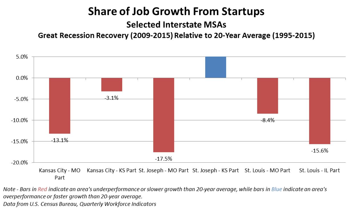 A week ago I wrote of the decline of entrepreneurial activity in the nation, Missouri, Kansas City, MO, and Saint Louis, MO. The share of workers in firms aged five years or less has steadily dropped in the U.S. and Missouri. However, the rate in Missouri has fallen faster than the national average since 2001.