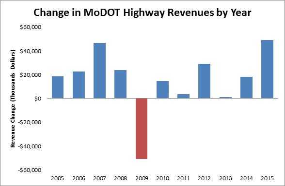But it appears now that MoDOT has had a reprieve. Revenue dedicated to the state highway system rose 4.5% in FY 2015, much higher than expected. That gives MoDOT an additional $47 million in state funding and saves $160 million in federal matching dollars that otherwise would have been lost.