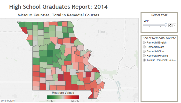 Scores on the ACT should be paired with other data to determine how well schools, districts, and states are preparing students for college. Let’s take a look at another measure—remediation rates. The map below shows the percentage of students by county who enrolled in remedial coursework in college (coursework they already should have completed in high school) in 2014. Red indicates higher percentages and green indicates lower percentages of enrollment in remedial courses. In the lower half of the state, there is a whole lot of red—63.3 percent of graduates from Ash Grove High School in Ash Grove, Missouri, for example, enrolled in remedial coursework in 2014.