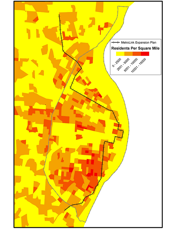 As we’ve discussed many times before, Saint Louis is a dispersed region, both in terms of where people work and where they live. Most residents live and work outside of Saint Louis City, and more people commute into Saint Louis County than Saint Louis City for work. The area in the region with the most employees and the highest payroll is not downtown, but West County. Nevertheless, the North–South MetroLink plan would route riders in and out of downtown Saint Louis, as if the year were 1904. In terms of population density, most of Saint Louis City (and nearly the entire planned route of North-South MetroLink) has less than 5,000 residents per square mile. Cost-effective light rail systems generally have population densities nearing 20,000 people per square mile around stops.