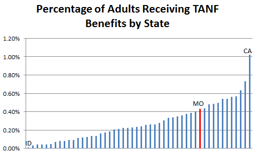 Currently, DSS only determines eligibility annually. Thus someone could move to another state between eligibility checks and could continue receiving benefits for up to a year. As of 2014, Missouri had a large percentage of the adult population on welfare compared to other states, ranking twelfth in participation rates (see the chart above).