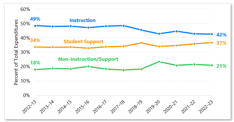 When considering the costs of running a school, we may think of items like teacher salaries, classroom technology, textbooks, and tutoring services. It seems natural to assume that instructional expenses would dominate school budgets. However, statewide trends over the past decade reveal an interesting story. Instructional costs have been decreasing as a proportion of overall spending, while expenditures on student support and non-instructional services have steadily risen. In fact, student support services are now on the verge of overtaking instructional costs in Missouri.