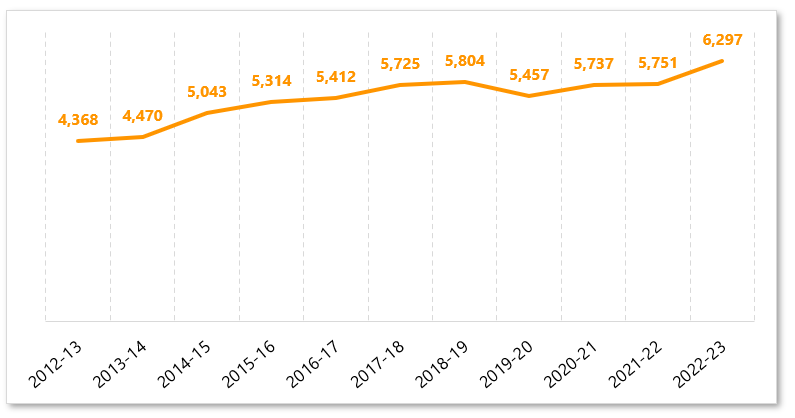 Figure 1 is even more fascinating when considering that the total number of teachers has continued to rise in Missouri, with student enrollment decreasing in the same time period. Even with 26,000 fewer students than in 2012–13, there are around 4,000 more Missouri teachers and 2,000 more student support staff (as of 2022–2023, the most recent data).
