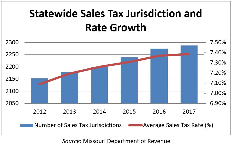 What do owners of the luxurious Intercontinental Hotel in Kansas City and the St. Louis Cardinals have in common? They’re both leveraging special sales tax districts to subsidize their private ventures. The number of sales tax jurisdictions in Missouri has ballooned by 33% over the past 20 years. As the chart below shows, this growth correlates with rising sales tax rates. In short: the more districts, the higher the taxes.