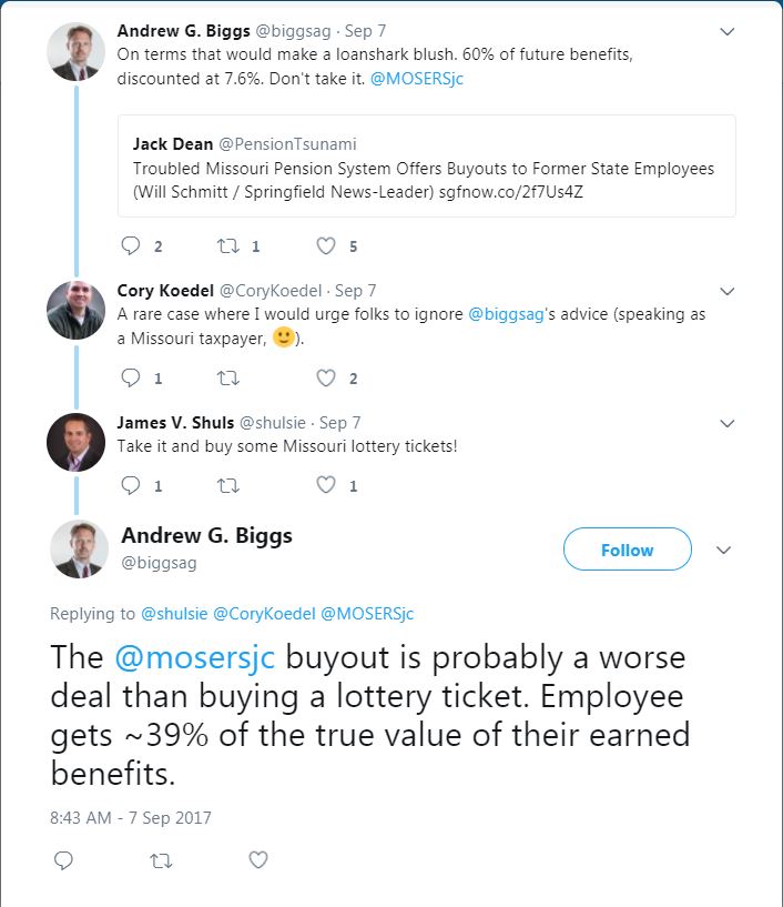Biggs suggests MOSERS pensioners shouldn’t take the deal. Koedel and I offer responses in jest, as Missouri taxpayers we stand to benefit from MOSERS shoring up its bottom line. Then Biggs offers a startling calculation. He suggests the buyout is worth approximately 39% of the value of the worker’s benefits. I doubt that’s actually worse than the odds on a lottery ticket, but it is certainly not a good payout.