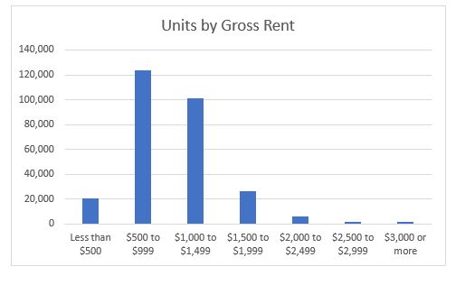 As the figure below shows, there weren’t many rental units available for less than $500/month at the time the survey was conducted, but there are more than 123,000 available between $500–999 per month. Moreover, the data below are not broken down by the number of bedrooms. Undertaking an even more granular analysis of the balance between housing demand and supply through a decomposition by family and unit size is left for future analysis.