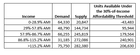 With that in mind, we can combine the data we’ve put together in the last two posts to strictly compare the estimates of affordable housing supply with demand. This allows us to establish a potential surplus or shortage for any income group. Using the table below, we can see for each income bracket the supply of affordable housing. Then, by subtracting the demand for units from the supply, we can determine whether there’s a surplus or shortage of housing at the 30%-of-income affordability threshold for households at each income level.