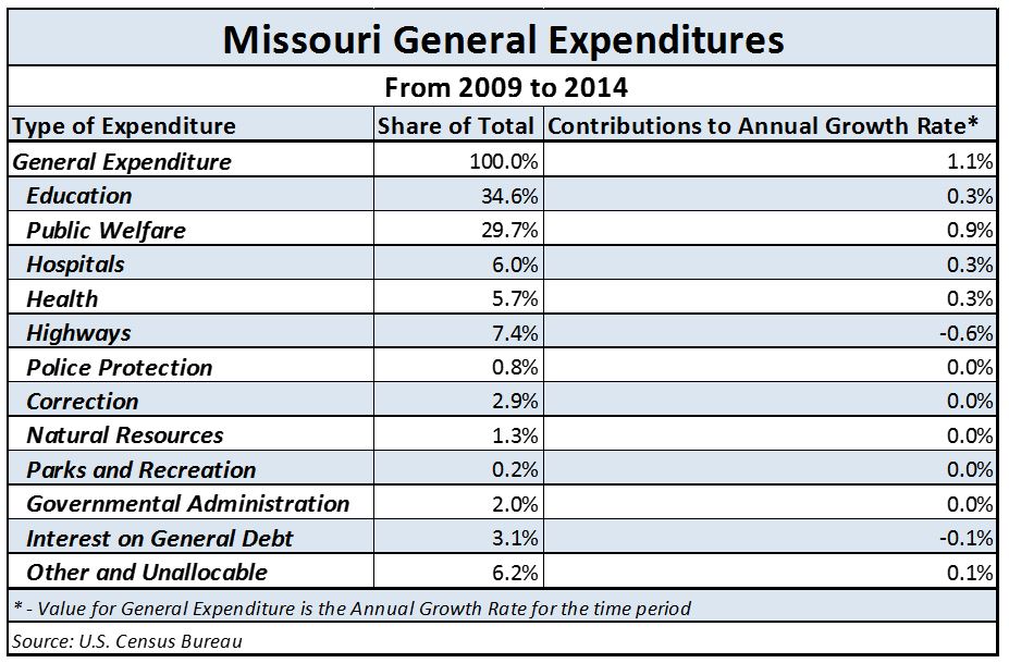 The table below, from the U.S. Census Bureau, shows that while education still commands the largest share of Missouri’s general expenditures, spending on public welfare has increased at a faster pace than spending on education since the 2008 recession.