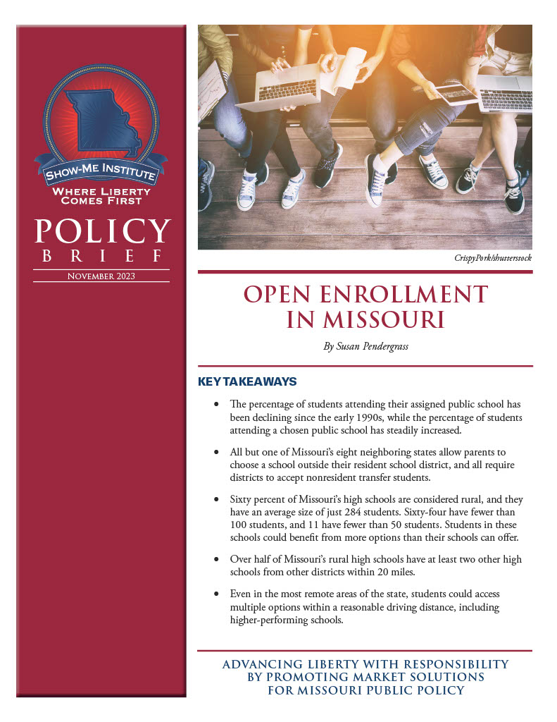 Download Entire Policy PacketOpen-enrollment policies allow families to choose their public school either within their home school district (intradistrict choice) or in a different district (interdistrict choice). The Reason Foundation issued a report that noted elements of a strong open enrollment policy. Those elements are incorporated in this example of a model policy. Such a policy would allow Missouri to compete with the states that have strong open enrollment laws. Below you’ll find an infographic highlighting key facts, possible reforms to current law, and a full policy brief.