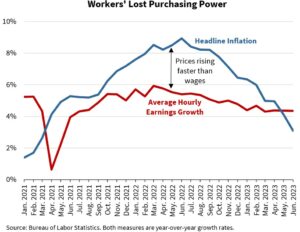 Lastly, and arguably most importantly, the U.S. economy has been facing a productivity crisis over the past two years. Productivity—that is, economic output per hour of labor—has decreased by nearly 2.5% since the second quarter of 2021, which is unprecedented. By comparison, productivity rose by nearly 5% from the first quarter of 2017 to the fourth quarter of 2019. Not coincidentally, that earlier period corresponded with household income rising by over $5,000 after inflation—meaning higher purchasing power—as compared with the recent decline in purchasing power of over $2,000. The figure below gives a stark visual reminder that prices have grown consistently faster than wages since the passage of the American Rescue Plan Act “stimulus” bill in early 2021, with price growth decreasing only in response to the Federal Reserve’s interest-rate-hiking campaign.