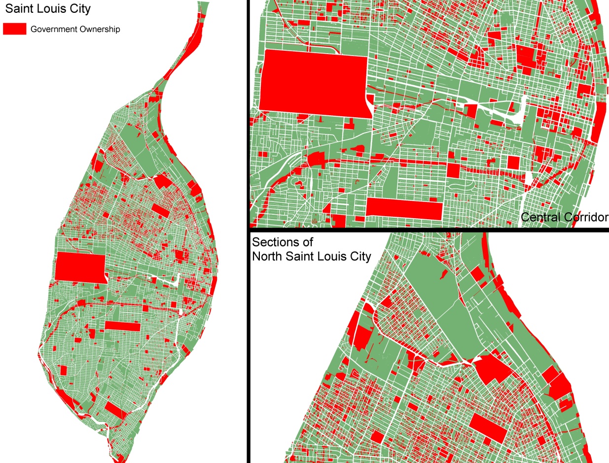 One type of entity that pays little or no property tax is government. This includes city, county, state, and federal government, but does not end there. In Saint Louis City, many properties are owned by other quasi-governmental bodies, including: the Bi-State Development Agency, the Metropolitan St. Louis Sewer District, Great River Greenways, the Land Reutilization Authority (LRA), the Saint Louis Convention and Visitors Commission (CVC), the Saint Louis Housing Authority, the St Louis Municipal Finance Corporation, and others. Altogether, government-owned properties make up almost 30% of all properties (by area) in the city, as the map below illustrates: