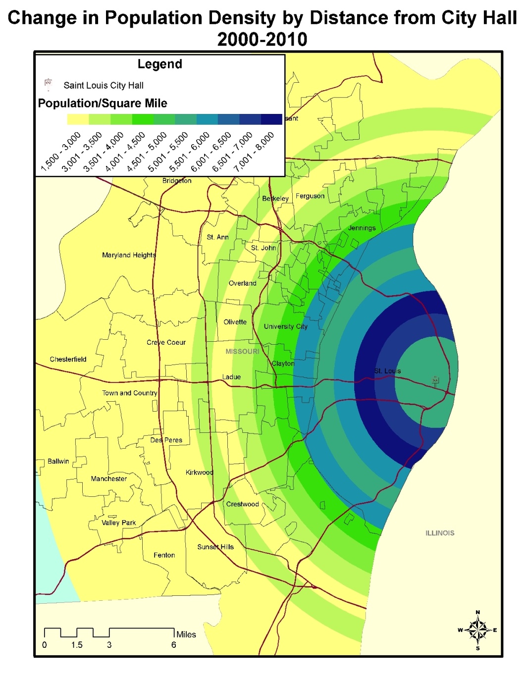 But what exactly is Saint Louis’s CBD the heart of? Certainly not the region’s population. As we’ve written before, Saint Louis’s downtown actually has a lower population density than areas farther away from the core, like the Central West End. Furthermore, the region’s population is extremely dispersed, with large sections of the population living more than 20 miles from city hall. The Saint Louis metropolitan area is region with more than 2.8 million residents, only a few thousand of whom live downtown: