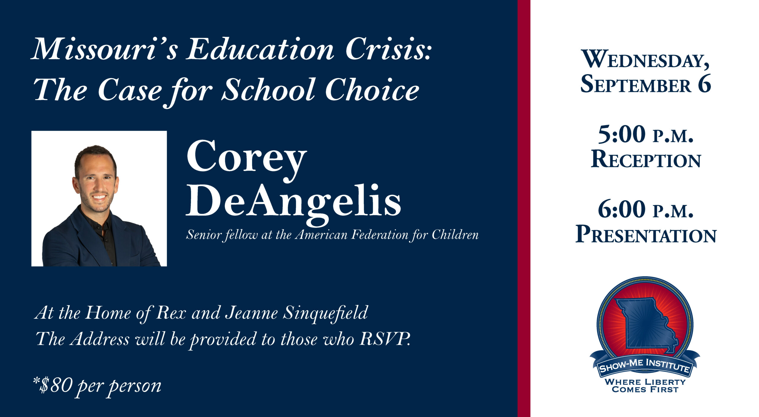Join the Show-Me Institute in St. Louis, Missouri at our annual Next Gen event as Senior fellow at the American Federation for Children, Corey DeAngelis shares his vision to revamp our nation’s education system. Corey sheds light on the challenges faced by, and failures of, today’s government schools revealing a rising tide of mediocrity, and explores the need for alternative solutions to solve America’s education crisis.