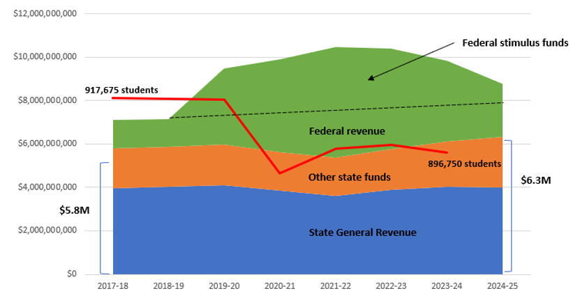 Let’s look at this with a clear head. The chart below shows Missouri state and federal revenue for public education, adjusted for inflation, from before the pandemic through the recently approved budget for the 2024–25 school year. In 2017–18, there were just under 920,000 students in pre-K through 12th grade in Missouri and the state legislature appropriated a total of $5.8 million (2023 dollars) from the general revenue fund and other state funds. The federal government kicked in another $1.3 million, largely for the Title I program for low-income students, the IDEA program for students with disabilities, and the school lunch program. Last year, even after the recovery from the pandemic enrollment drops, we had about 25,000 fewer students—a trend that is expected to continue. Yet, the legislature’s appropriation was about $500 million more than seven years ago.