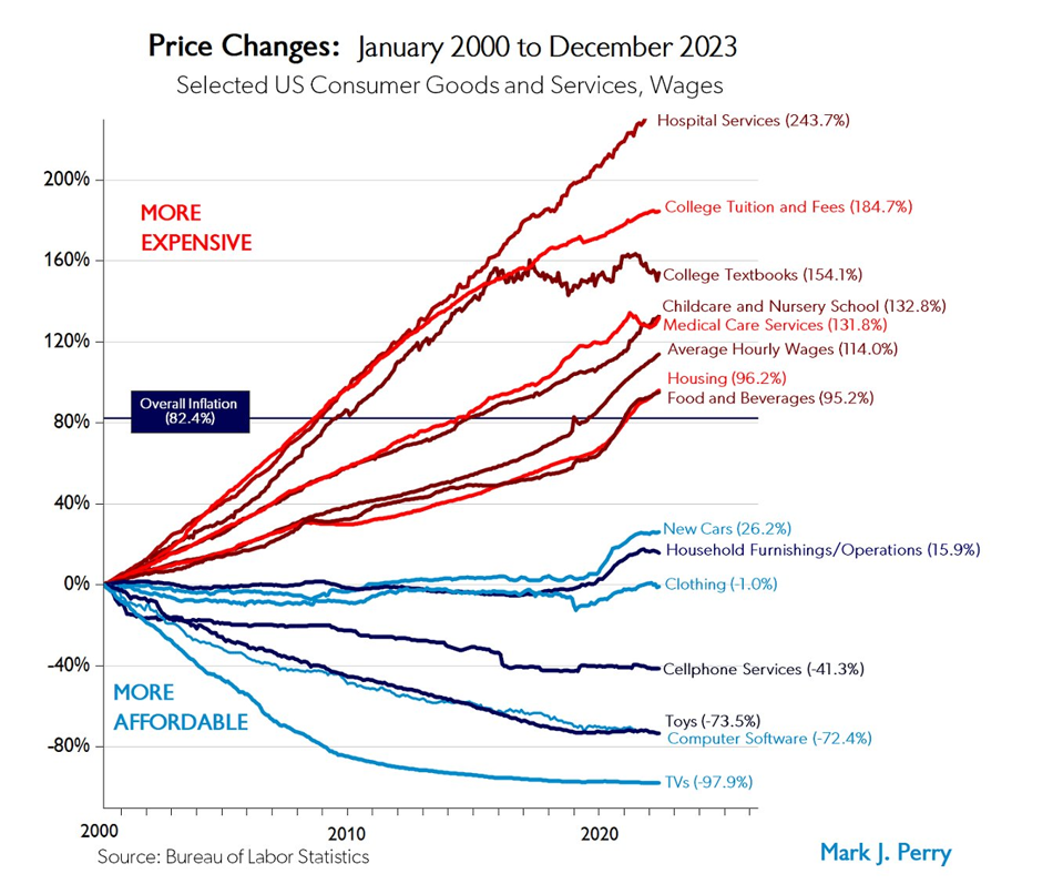 This chart is produced by Mark Perry at the American Enterprise Institute, and this version is an update he released in January of 2024. As he describes in an earlier blog post, there is an important pattern in the price trends: the greater the degree of government involvement in the provision of a good or service, the greater the price increase over time.