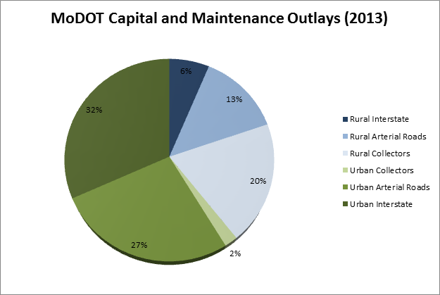 To show this, first we will look at total MoDOT capital and maintenance spending. As shown in the chart above, in 2013, 61% of total MoDOT outlays went to urban highways and 39% went to rural highways.