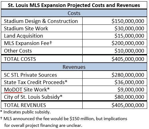 A group of local businesspeople (SC STL) is trying to lure a Major League Soccer (MLS) team to the Gateway City. The only catch is that SC STL is asking Saint Louis taxpayers to cough up an extra $80 million in new taxes to support the venture. In addition, as the Business Journal reports, SC STL is also asking for $40 million from the state of Missouri. Altogether, SC STL hopes taxpayers will pick up $129 million of their projected $405 million in costs. Below is a breakdown of those projected costs and revenues.