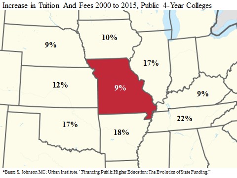 Missouri’s tuition increases are lower than most other states because state law prohibits colleges and universities from increasing tuition beyond increases in the consumer price index. The point here is that Missouri’s institutions are getting a double whammy. They are seeing reductions in state revenues and are simultaneously limited from raising additional funds through tuition.