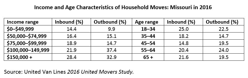 The income and age characteristics of those moving are more revealing. The table below breaks down of inbound and outbound moves by income (left-hand side of table) and age (right-hand side of table). The data suggest that those in the highest income ranks—incomes exceeding $100,000—were, in 2016, net out-migrants: more left Missouri than moved in. This accords with earlier results: Michael Rathbone and I found that, based on IRS data, those who moved out of Missouri tended to be higher income individuals.