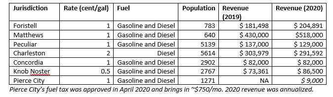 But what many Missourians don’t know (and even many local leaders) is that cities and counties can implement their own fuel taxes to raise money for local roads. Seven cities in Missouri currently use local fuel taxes to supplement what they receive from their distribution of the state fuel tax (cities get about 16 percent of state fuel tax revenue). These taxes raise up to hundreds of thousands of dollars each year and the cost rarely exceeds 1 cent per gallon for drivers.