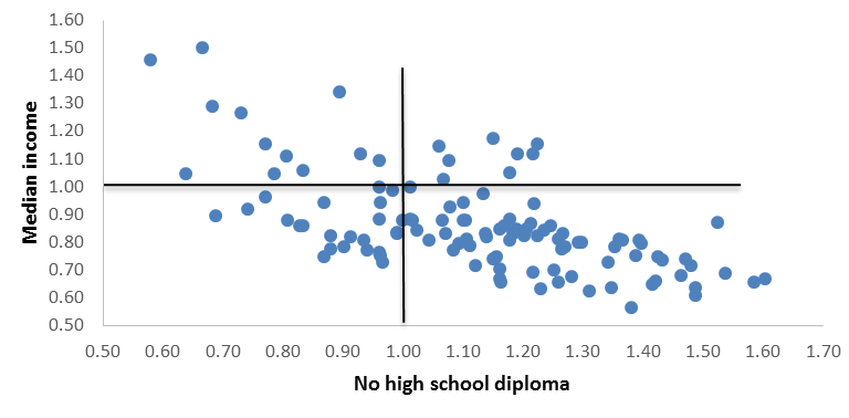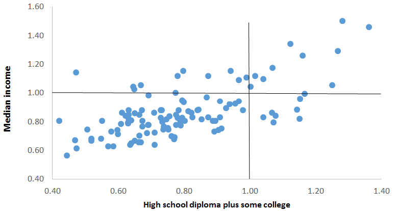 To illustrate the education–income relationship we use scatter plots, reproduced below. Each dot represents a county in Missouri. Let us explain how each county is located in the plot. Each county’s value (income or education) is measured relative to the state average. If a county’s median income is equal to the state average, its median income value in the plot is 1.0. If the county’s median income is less than the state average, its median income value is less than 1.0; if it is greater than the state average, its value is larger than 1.0. A similar technique is used to measure educational attainment across counties. The combination of a county’s relative median income and relative educational attainment value locates it on the scatter plot. If a county is just like the state average on both measures, it would be located at the intersection of the black lines. The vertical axis is county median family income relative to the state average in 2015. The horizontal axis is one of two education measures in 1990, again relative to the state average.